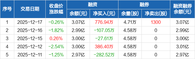 峰璟股份:融资净买入776.94万元,融资余额3.07亿元(12-17)
