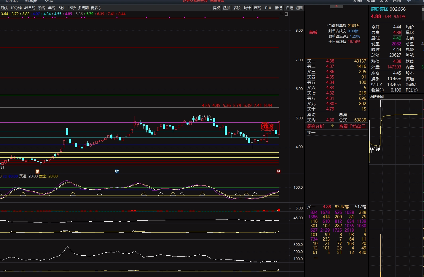 $德联集团(SZ002666)$ 在 4.85 上方不买只看热闹, 在 4.55 有一定支撑,不有效跌破就买,跌破就不买,这是纪律坚决执行。宁可错过也不犯错!!!它在主图最上方显示上方的阻力位依次有 5.36 5.79 6.39 7.41 8.44 等,哪里冲不过就在哪里出!只希望他在回踩 4.55 不跌破时买进,跌破千万不要买!这是纪律!坚持不追涨原则。天天有股选何必去追涨呢。如果跌破 4.55 则可能向下到 4.34 .4.07 等等下面的就不说了,不严格扏行止损纪律就同样可以向下计算出万丈深渊! 25年元月1号起选股业绩是1号选的海德控制2号3号6号7号8号9号都涨停,7↗连板,,6号选的海鸥股份7号8号9号都涨停4连板,9号选的金奥博7连板,9号选的苏豪弘业6连板,14号选的壹网壹创15号20cm板16号冲了十五六个点两天三十多个点,11个交易日 25个10%了,理论上7个10%就翻倍!我这个股市义工且神枪手值得关注! 优化升级后的人工智能选股大数据模型选出来的有些是小阴小阳的这种涨的慢但安全要有耐心,有些是已经涨停板了的当天买不到,只能等次日回调不跌破我计算的某个关键点位时买入,跌破了的千万不要买!这是纪律。板后的追高风险太大,宁可错过,也不能犯错误!先慢慢接受慢慢适应。要知道首个涨停板就是庄家的宣誓!只要满足一些技术条件或事件条件就不要太怕什么!注意买了后不寄望都会有涨停板,买后有赚就可以,赚了就跑,快进快出,模拟手动量化交易。 这个选股器隔三差五总能选出连板飚升股,效果很好!虽然还是不能百分百准确,但网上能够经得起公开验证的不多见,比一般的强。可以查查我24年8月19号收盘后选的常山北明的帖子,从6.23最高涨到11月1号39.88翻了5.4倍!其他连板飚升股太多了懒得统计!网上那些大w只讲板块和指数,那是放空炮!没有实际意义,买什么买哪个我直接点对点精准出击。不要浪费时间看大w的。 总是有些没有修养的喷子喷人,我会拉黑永久屏蔽他,不能让喷子知道这个重要点位,这些点位对已经持有的人有很大提示参考价值。 我画的这些彩色横线是我自己研究了多年才得出的,每根横线处股价有效冲过了就是支撑,冲不过就是阻力,是我的独自研究的,很准的。请仔细看照片,也请你自己同时在你自己电脑行情软件上我说的那几个价位上画横线,可以看见已经走过来的历史很清楚地展示出来了支撑和压力,未来也同样,所以要重视这些彩色横线所指价位或者主图最上方标注的价位!不要听那些大W大砖家的!不要听他们耍嘴皮子!更不要看他们耍笔杆子! 超级短线票不要指望一步就涨好几个价位,有壹两个价位就够了,通常赚1个价位即1个台阶就走,当然能碰到连板股更好,但不强求,坚定只做超级短线理念!赚了钱就跑,象抢劫犯一样,赚了不跑就会由赚变亏,就会被套被关号子坐穿牢底! 选出1个股票还没有买就先告诉你哪几个价位是阻力,在哪根彩色横线冲不过就要抛出,这是全市场人 士没有的!股评师做不到! 智能选股大数据模型就是程序化选股,程序是固定的,同时程序不识别文字只识别交易数据,同一个股不同波段的高低点价格不一样,不同个股更不一样,选出来的股就只有名称不同,但用的程序是相同的,所以你们看到我的文章只有股票名称和价格不一样。 所选个股还做不到百分百成功,还需要各位再全方位精选,我的只是参考 。 长文里有些话是我以前失败教训的总结,要重视!并且提示关键点位后难点在执行力,比如某个点位明显冲不过或撑不起来一定要抛的时候,却犹豫不决错失良机。所以要磨练执行力! 欢迎关注不关注就不能及时了解我的新选个股动态。粉丝多少对我无所谓,如果不关注,对你可能少了一个提示你抓发财机会的朋友。对你可能少了一个提请你抓飚涨个股的朋友,我这个股市义工朋友值得信赖!!! 如果赞成我对某个股的观点请在(评论)栏发个笑脸或花朵,不要(点赞)!!!因为(点赞)不能更新帖子在股吧的排序和顶帖,犹其是已经持有的人多顶帖是在为你自己拉人气。人气指标是公开的公认的重要指标,涨得好的都是人气指标很高的,你手中的股票你自己不拉人气别人怎么会拉。 我的股友不是几百几千个,而是几万个,他们都是经历过返复对我考察后才接受我的,几万个股友铁粉都是聪明绝顶,不可能被骗,我也没想过要行骗,更没骗的本事,致少有一份上万的退休工资没必要行骗,何况只要遵守纪律在股市捞钱也容易,几万铁粉的信任,我必须诚心相待才对得起朋友!尽量尽力做好股市义工!