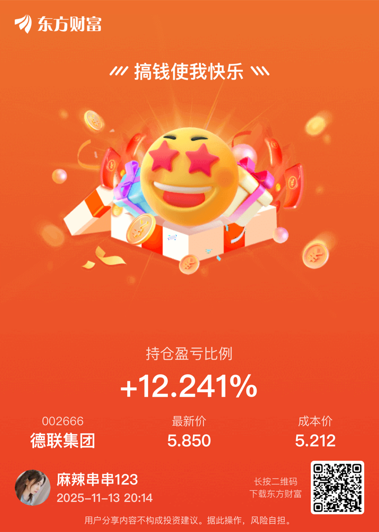 $德联集团(SZ002666)$ 拿了28天,还没到我止盈点,但今天到向上试盘并且站稳,让我比较满意,所以我会继续拿着,还没设置条件单。冲鸭,我的小太阳