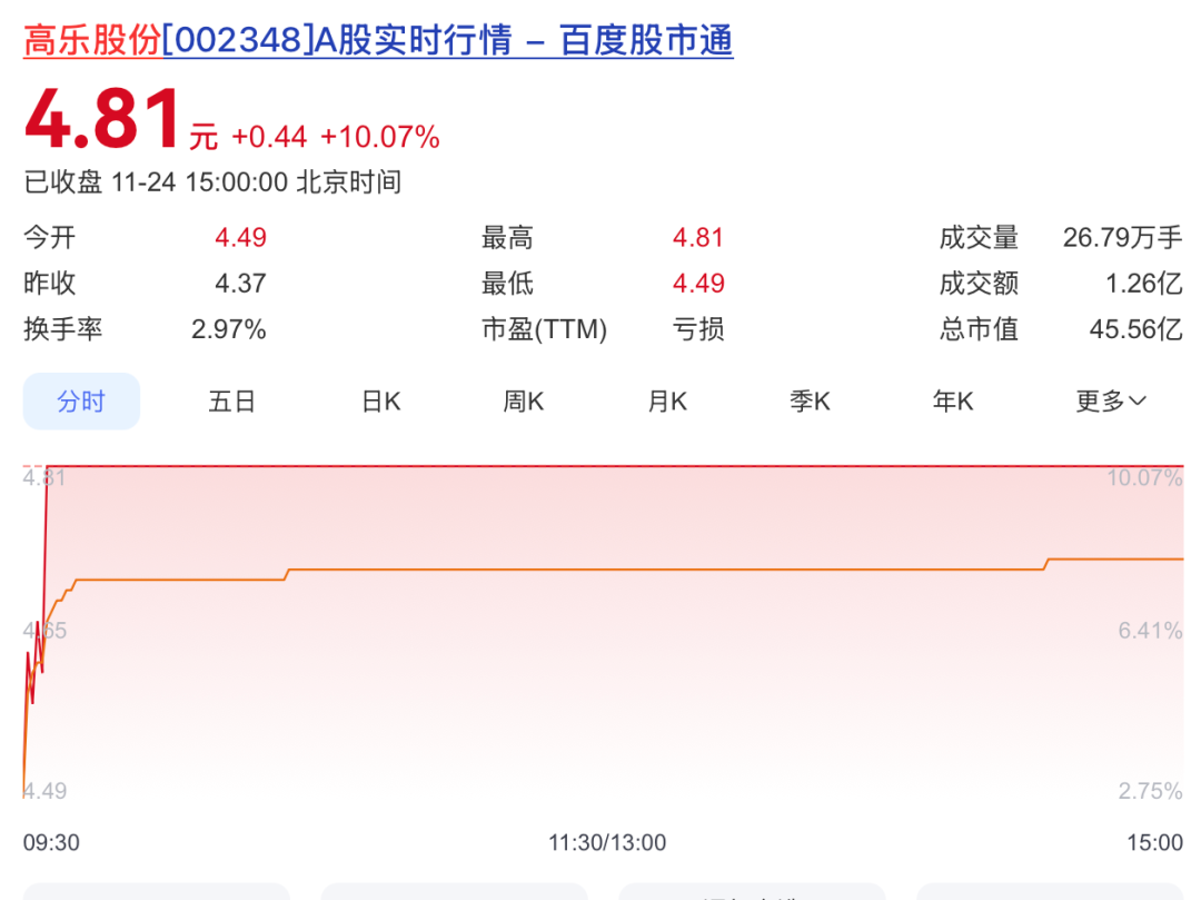 高乐股份今日涨停,截至今日收盘股价报4.81元/股。