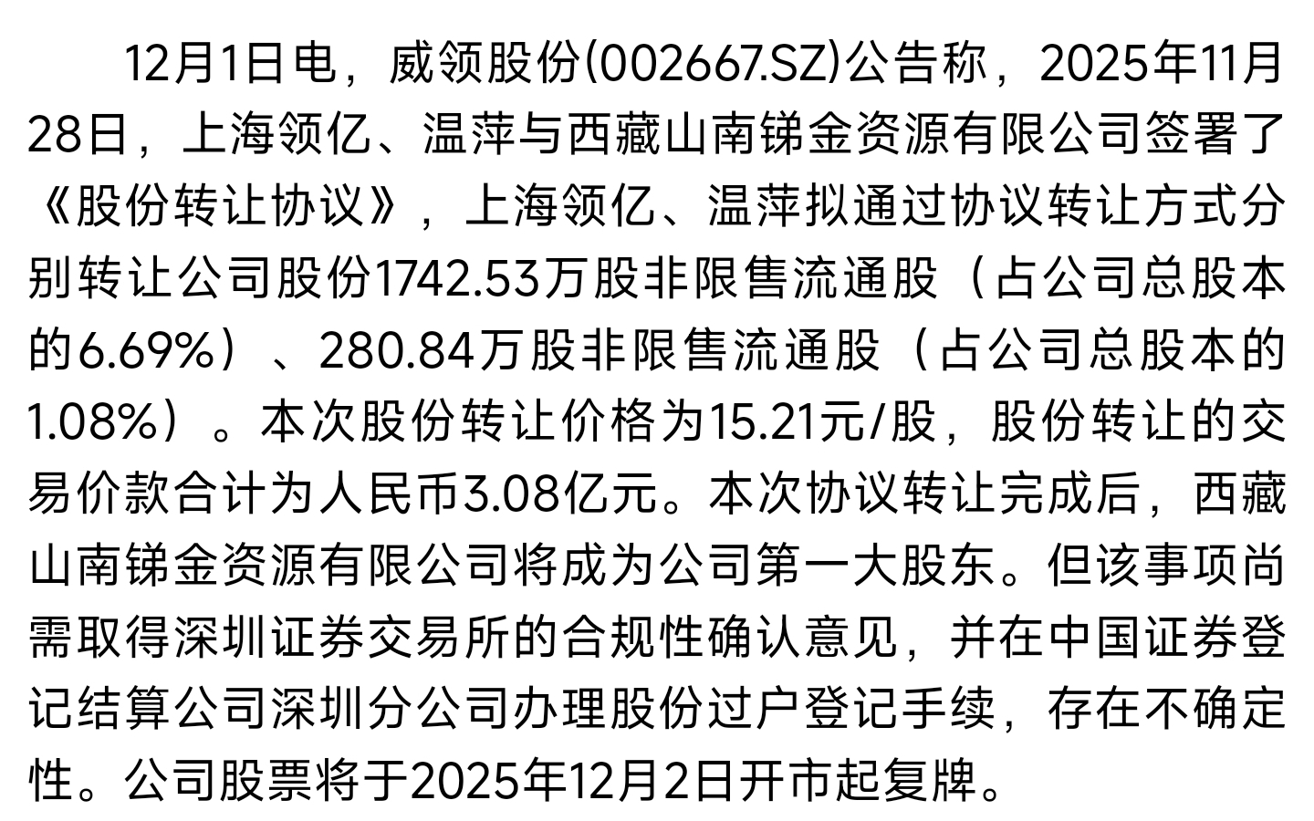 $威领股份(SZ002667)$ 怪不得砸盘后15.2今天怎么都要护着。研究了一下转让股价为15.21。。肯定得托。。。个人觉得明天得涨。。个人观点。今天一条大长腿。吓跑了很多人,进入资金还为正。。个人觉得后面18没问题,个人观点。不爱听的大佬请勿喷我