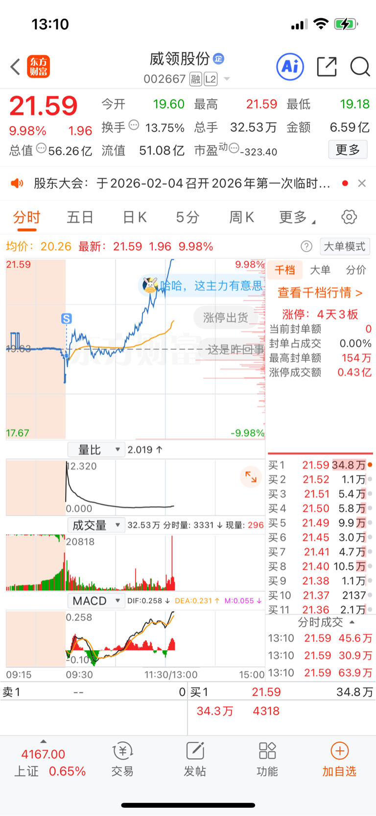 $威领股份(SZ002667)$