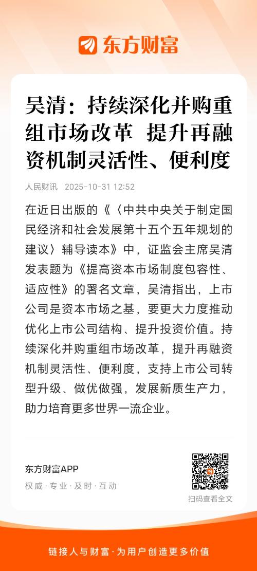 在近日出版的《〈中共中央关于制定国民经济和社会发展第十五个五年规划的建议〉辅导读本》中,证监会主席吴清发表题为《提高资本市场制度包容性、适应性》的署名文章,吴清指出,上市公司是资本市场之基,要更大力度推动优化上市公司结构、提升投资价值。持续深化并购重组市场改革,提升再融资机制灵活性、便利度,支持上市公司转型升级、做优做强,发展新质生产力,助力培育更多世界一流企业。
