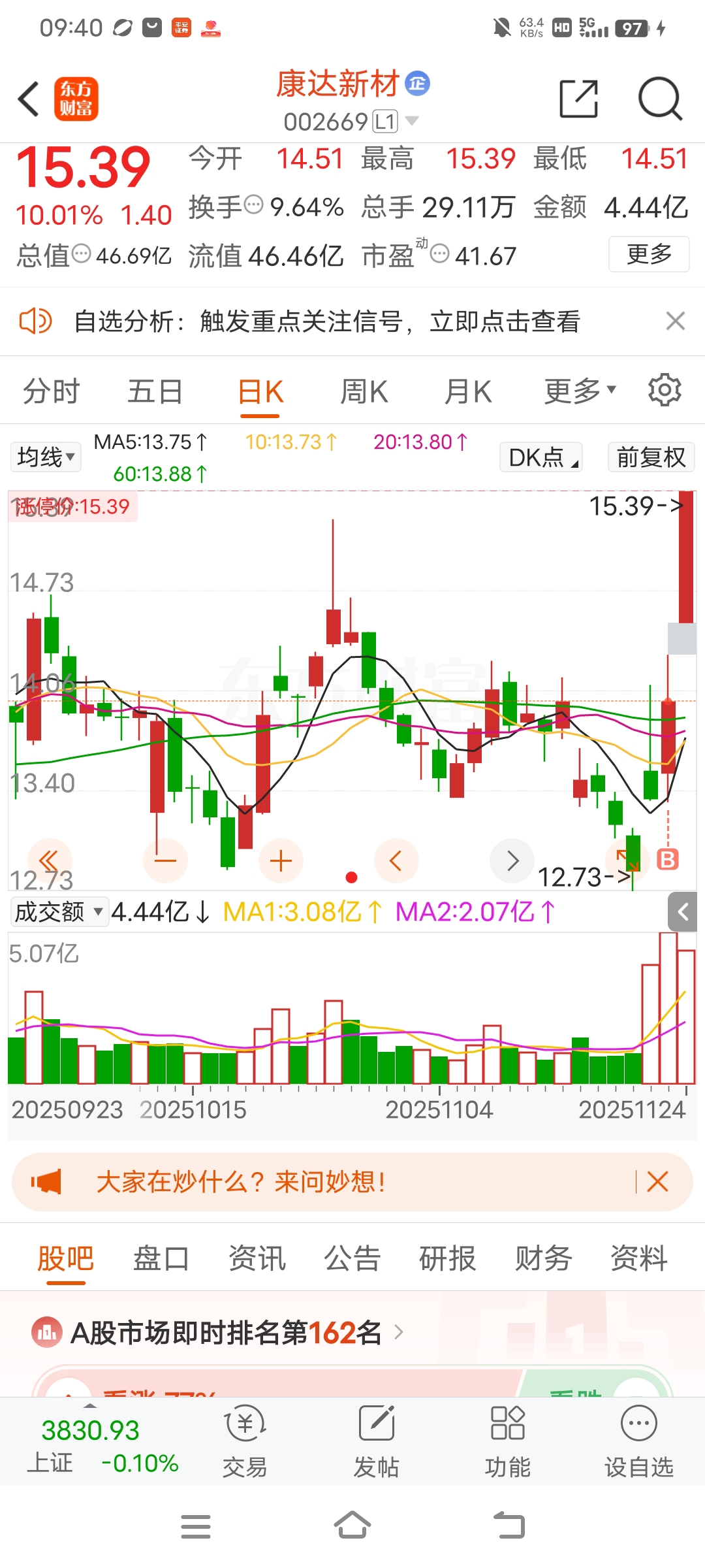 $康达新材(SZ002669)$ 涨停了,现在的量还不够,如果量上去了,还维持涨停的态势就可以高看一筹。
