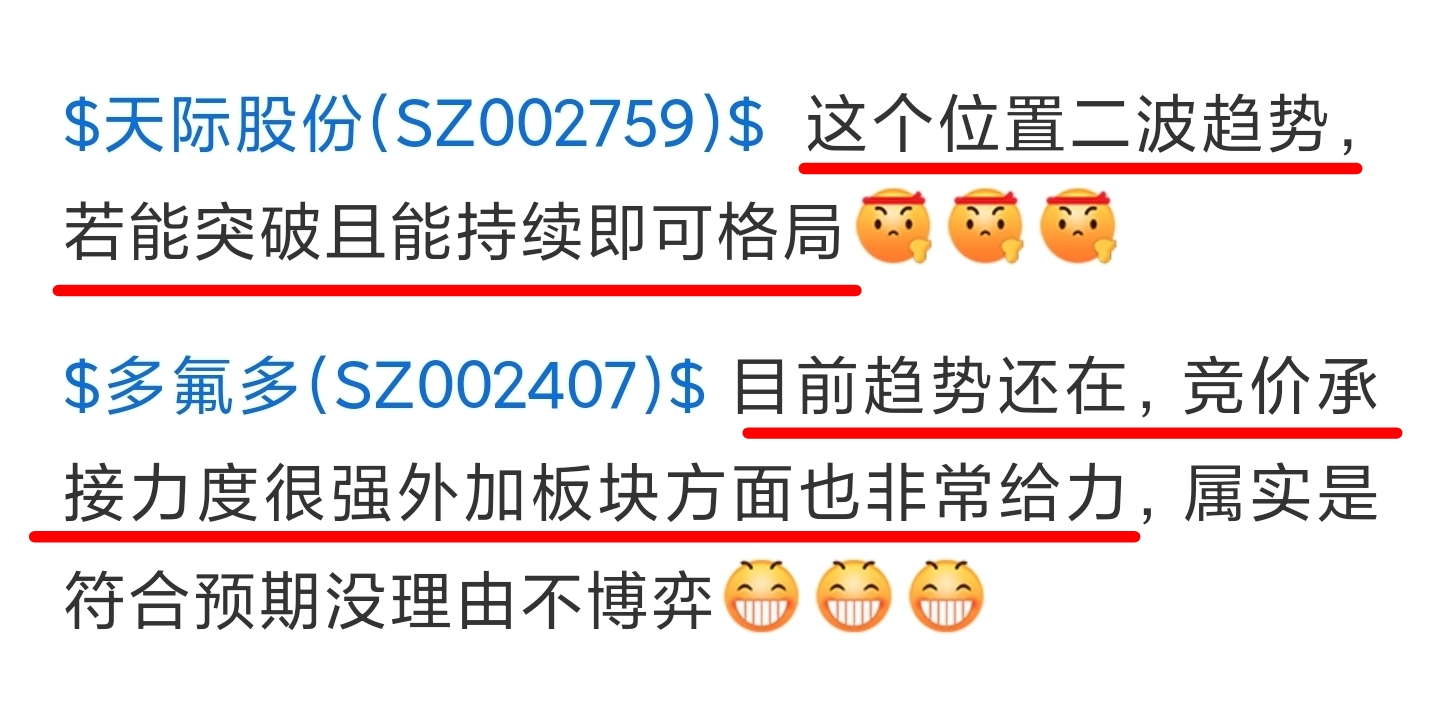 $天际股份(SZ002759)$ $多氟多(SZ002407)$ 推演再次得到,小黑们说话,两天两只标的将近三十个也是舒服咯