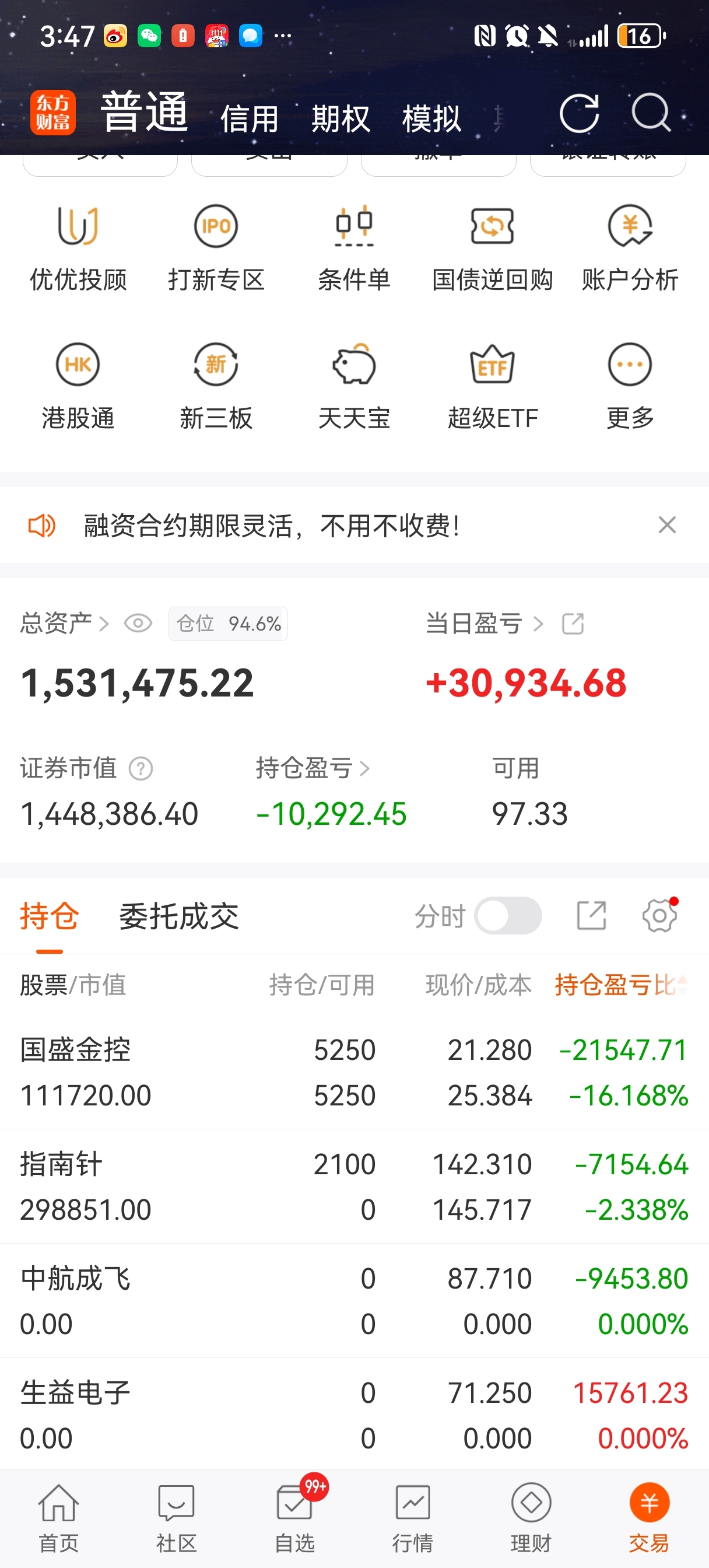 $国盛金控(SZ002670)$ 赚钱没走,最后平盘出了大部分仓位,周五重仓的三只国盛金控,$中航成飞(SZ302132)$ $生益电子(SH688183)$ ,中航和生益电子早上高点走了,盘中赚了6万多,收盘只剩3万,利润直接减半,小仓位的指南针,汇金股份高点抛了底仓,结果新买的追高了,看好一只明天看对不对