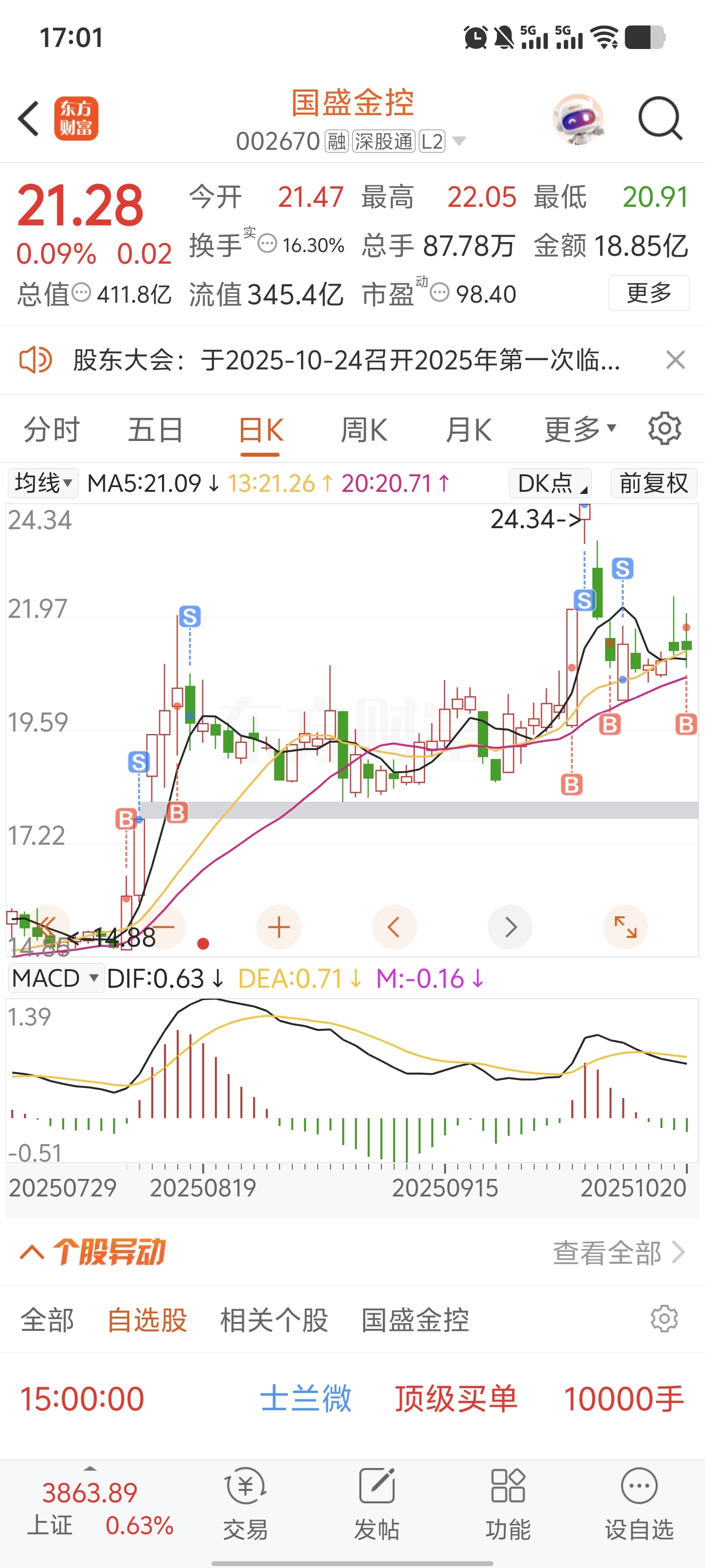 $国盛金控(SZ002670)$ mei ri han天天创新高。我们天天震荡套人。明天全仓干证券。无所谓了。