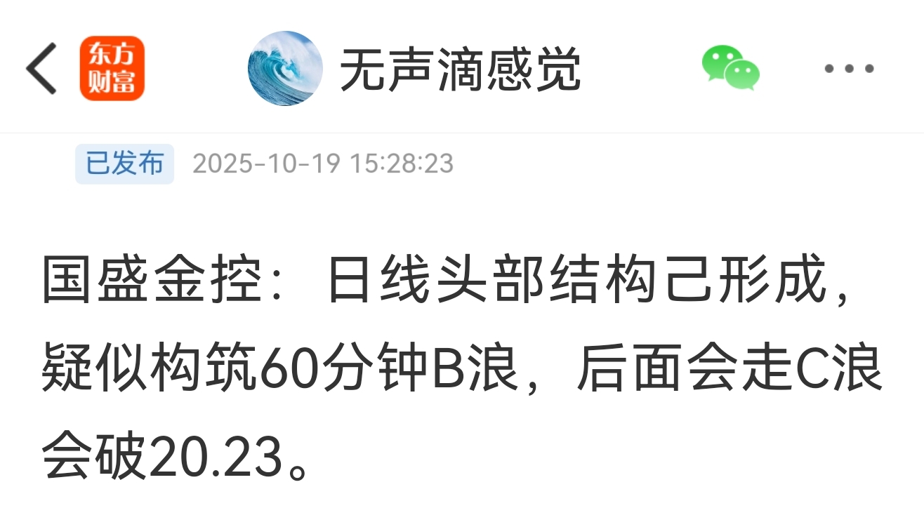 10月19日,我讲国盛金控:日线头部结构己形成,疑似构筑60分钟B浪,后面会走C浪会破20.23。