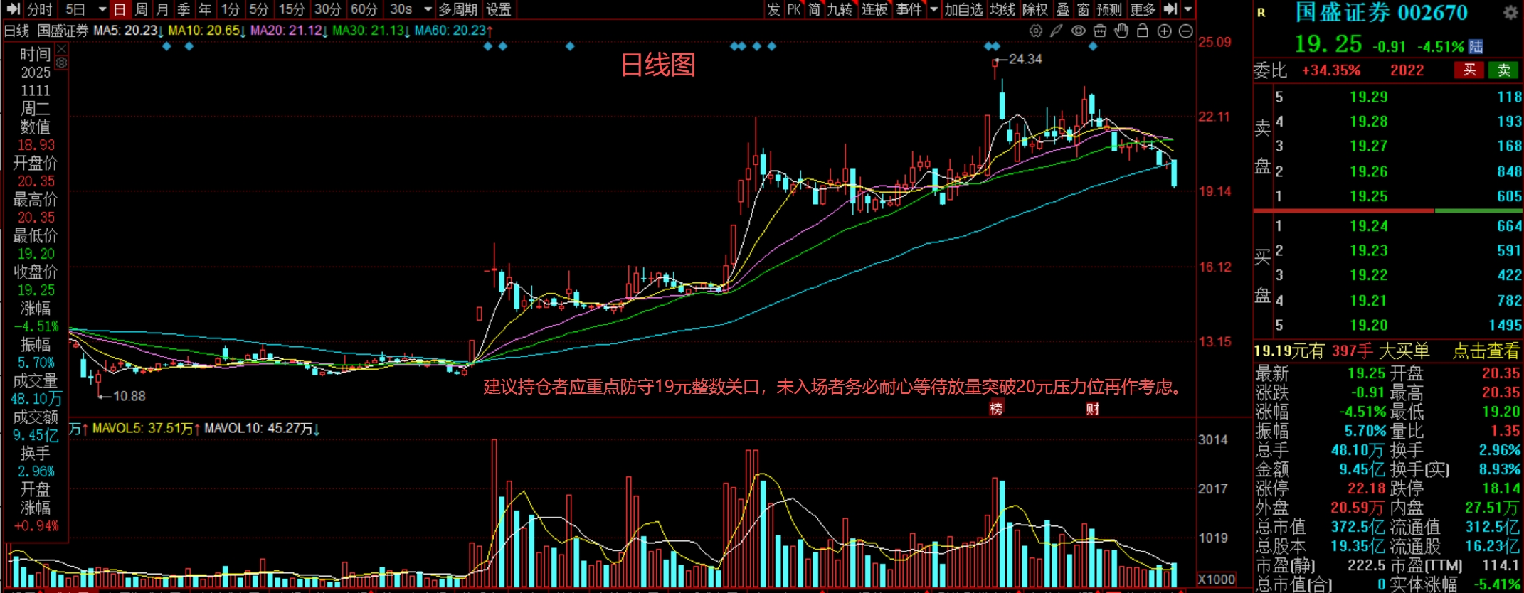 今日股价收于19.25元,下跌4.51%,技术面看,形态明显转弱。股价被中短期均
