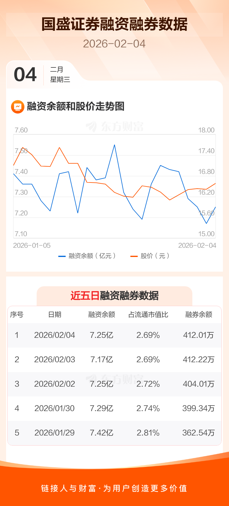 交易所最新数据显示,国盛证券于2026年2月4日获融资买入4146.81万元,融资偿还3343.36万元,当日融资净买入803.45万元。目前,该股融资余额7.25亿,占流通市值比例为2.69%。