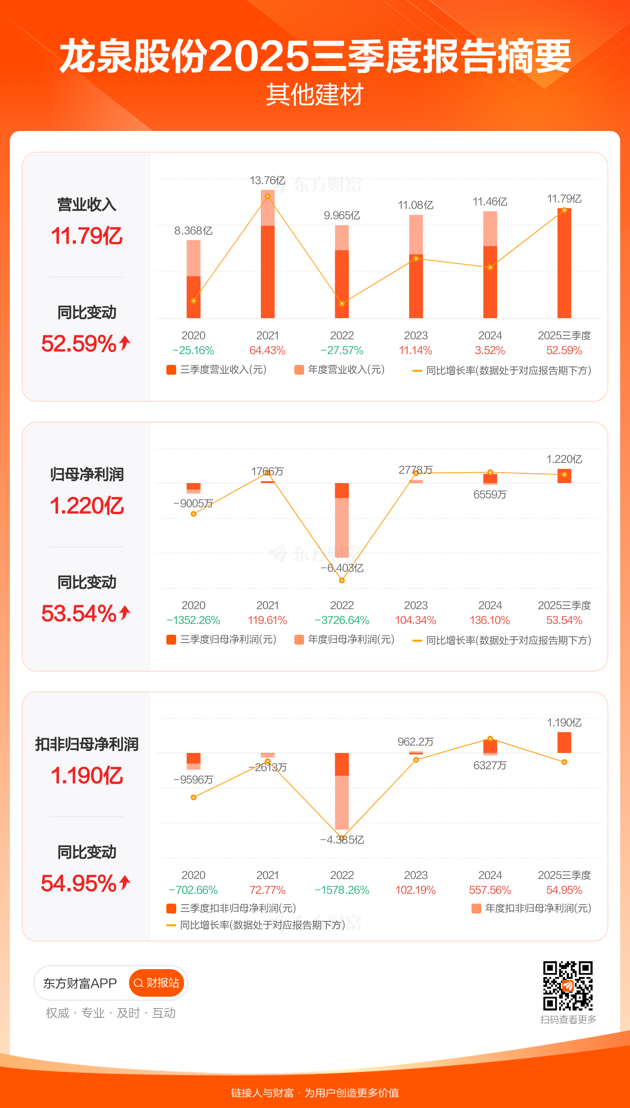 龙泉股份10月30日发布2025年三季报显示,公司前三季实现营业收入11.79亿元,同比增长52.59%;归母净利润1.22亿元,同比增长53.54%;扣非归母净利润1.19亿元,同比增长54.95%。