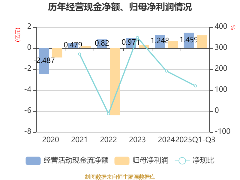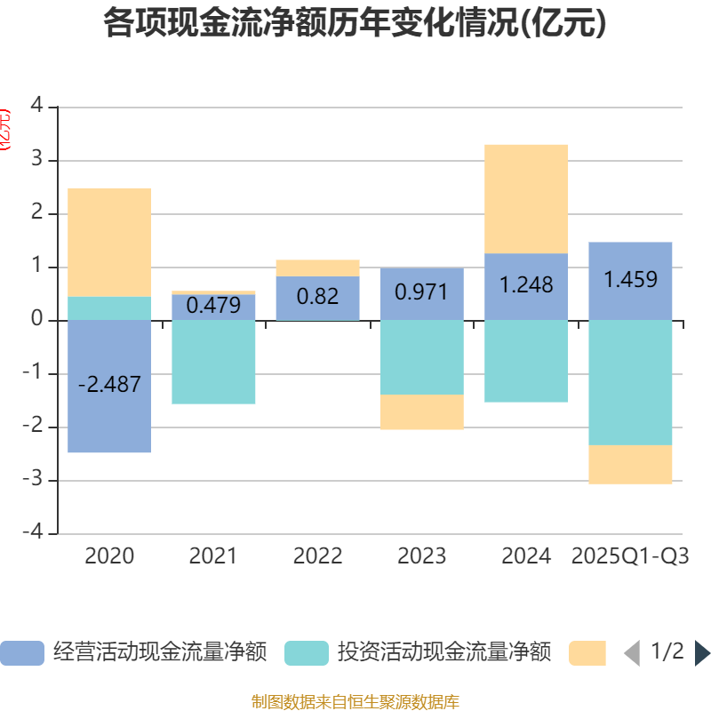 2025年前三季度,公司经营活动现金流净额为1.46亿元,同比增长89.73%;筹资活动现金流净额-7309.39万元,同比减少7973.86万元;投资活动现金流净额-2.35亿元,上年同期为-3029.24万元。