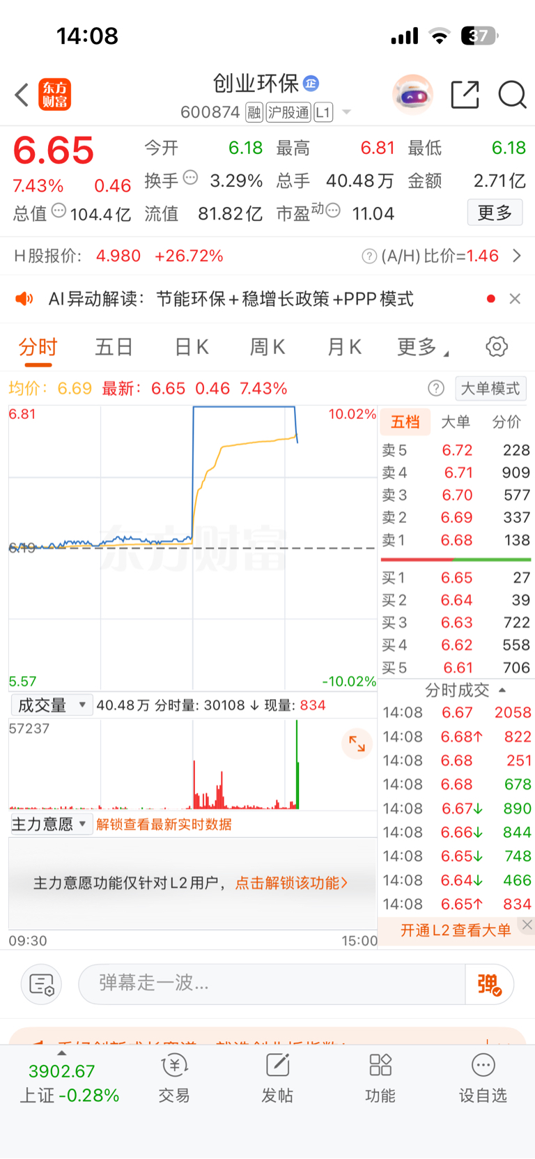 $东江环保(SZ002672)$ 我丢,创业都炸板了