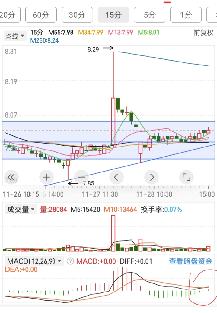 下周开盘,下周初绿不了的,15分钟走势一直在中枢内。并且金叉。主力行为,破了箱体