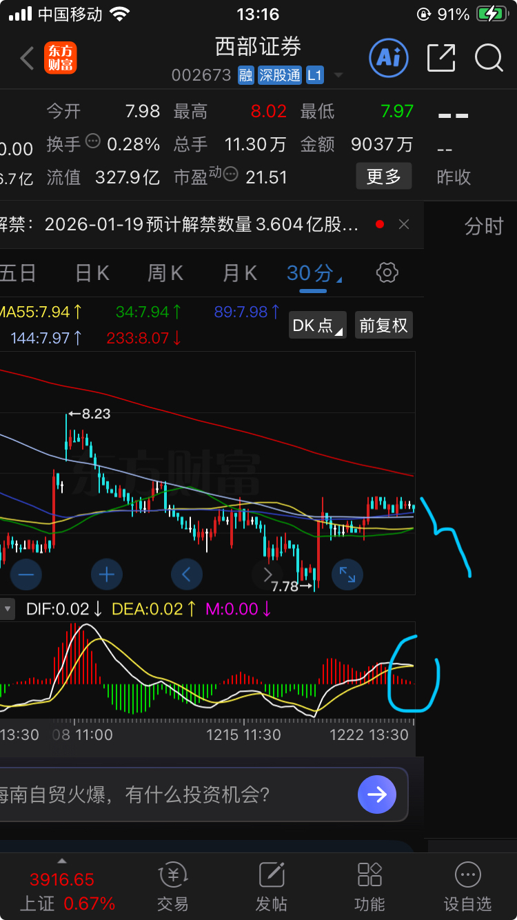 $西部证券(SZ002673)$ 快跑吧——30分钟级别均线态势判断,右侧平台顶背离型,相当地不好