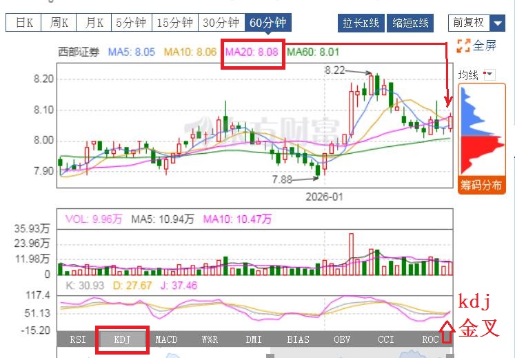 60分钟K线图:收盘刚好收在MA20线上,不多不少,可上可下,不过,KDJ指标金叉