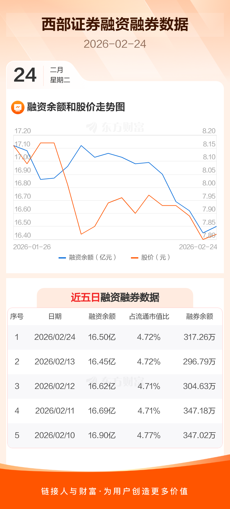 交易所最新数据显示,西部证券于2026年2月24日获融资买入1772.83万元,融资偿还1294.17万元,当日融资净买入478.66万元。目前,该股融资余额16.50亿,占流通市值比例为4.72%。