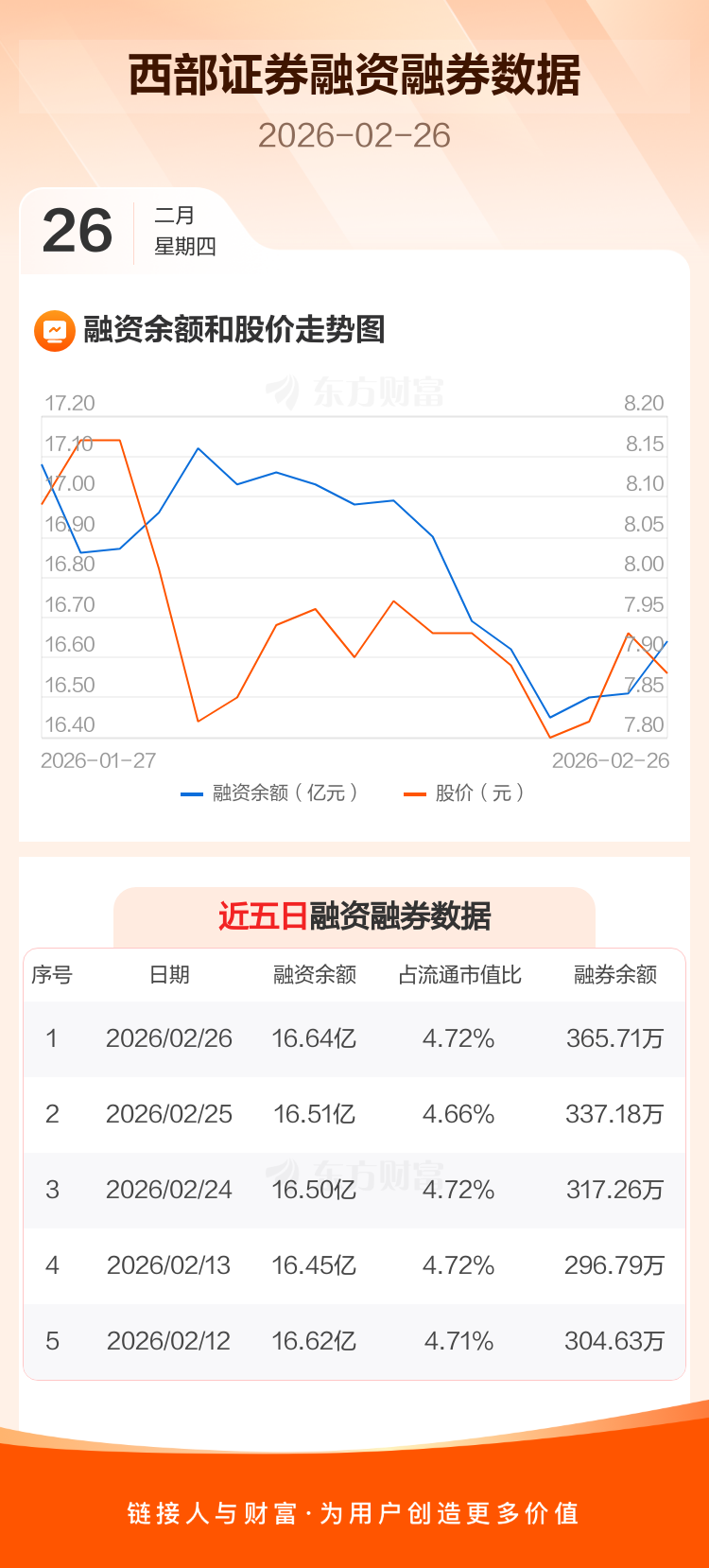 交易所最新数据显示,西部证券于2026年2月26日获融资买入2565.95万元,融资偿还1296.39万元,当日融资净买入1269.56万元。目前,该股融资余额16.64亿,占流通市值比例为4.72%。