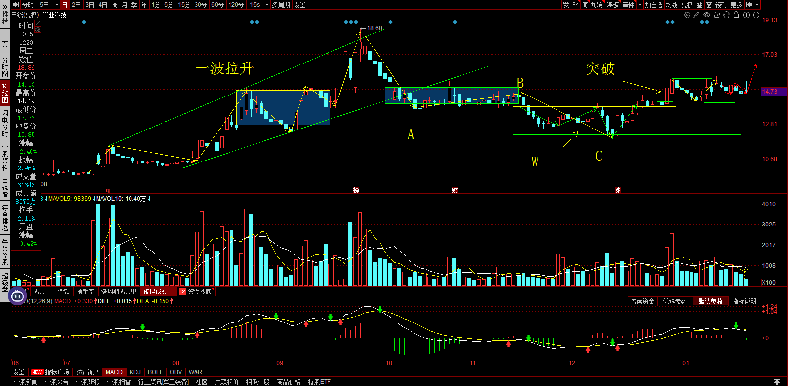 兴业科技不要置疑画饼师的画饼能力。1.整体结构1.拉高建仓:主力实力强劲。一波拉