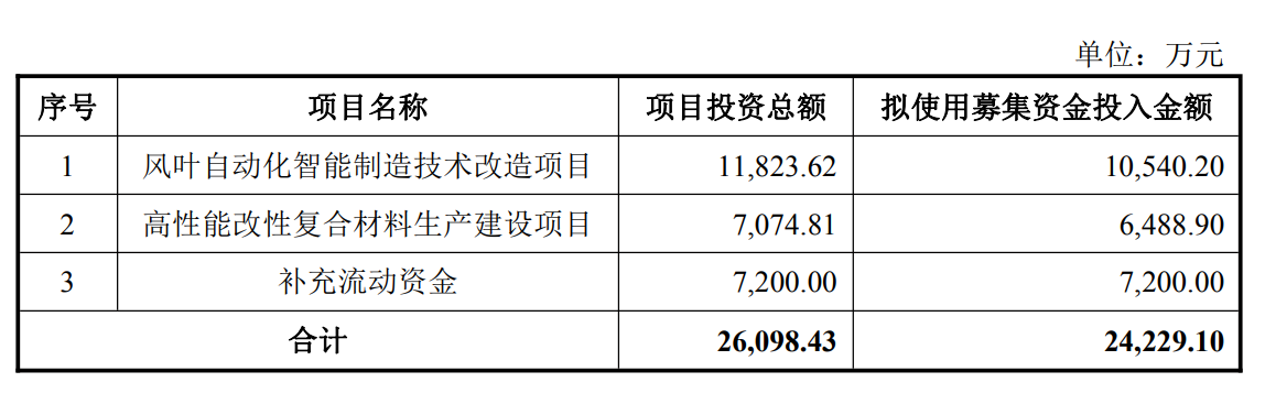 公司表示,本次募投项目符合国家产业政策及公司战略发展方向,项目实施后将进一步巩固公司在风叶领域的领先地位,拓宽改性材料应用场景,丰富产品矩阵,构造多元增长极。