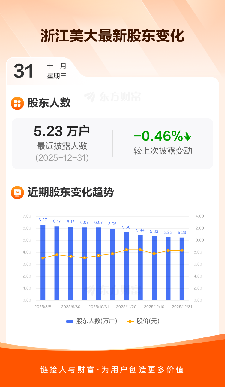 浙江美大:截至12月31日最新股东户数5.23万户,较上期减少0.46%