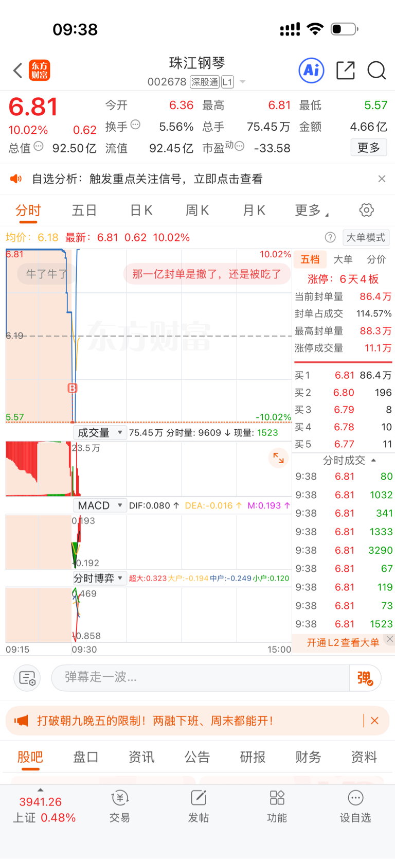 $珠江钢琴(SZ002678)$ 看看能不能嘚瑟到下班?