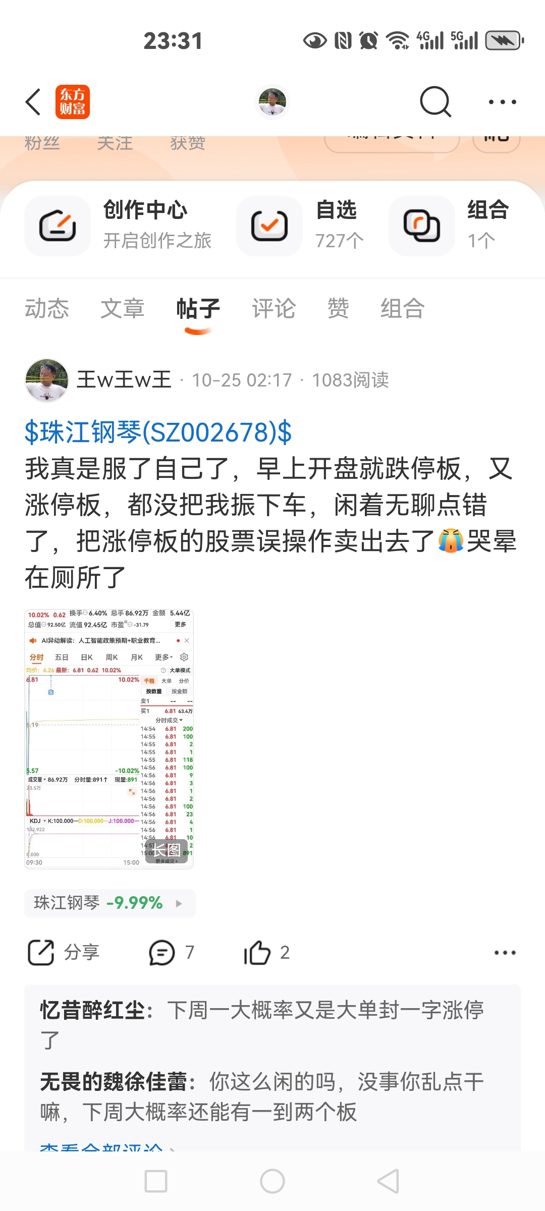 上星期五,见下图,我发贴抱怨自己手贱,点错了误操作,把涨停板的珠江钢琴卖了,后悔