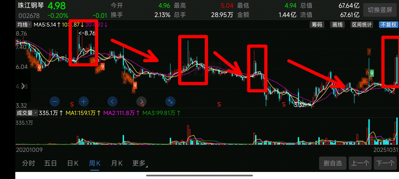 $珠江钢琴(SZ002678)$ 历史总是惊人的相似,但不会简单重复,看周线可知未来走势!每次周线出现大涨,第二周出现大阴!随后半年将持续阴跌!恭喜在大涨下车的朋友们!