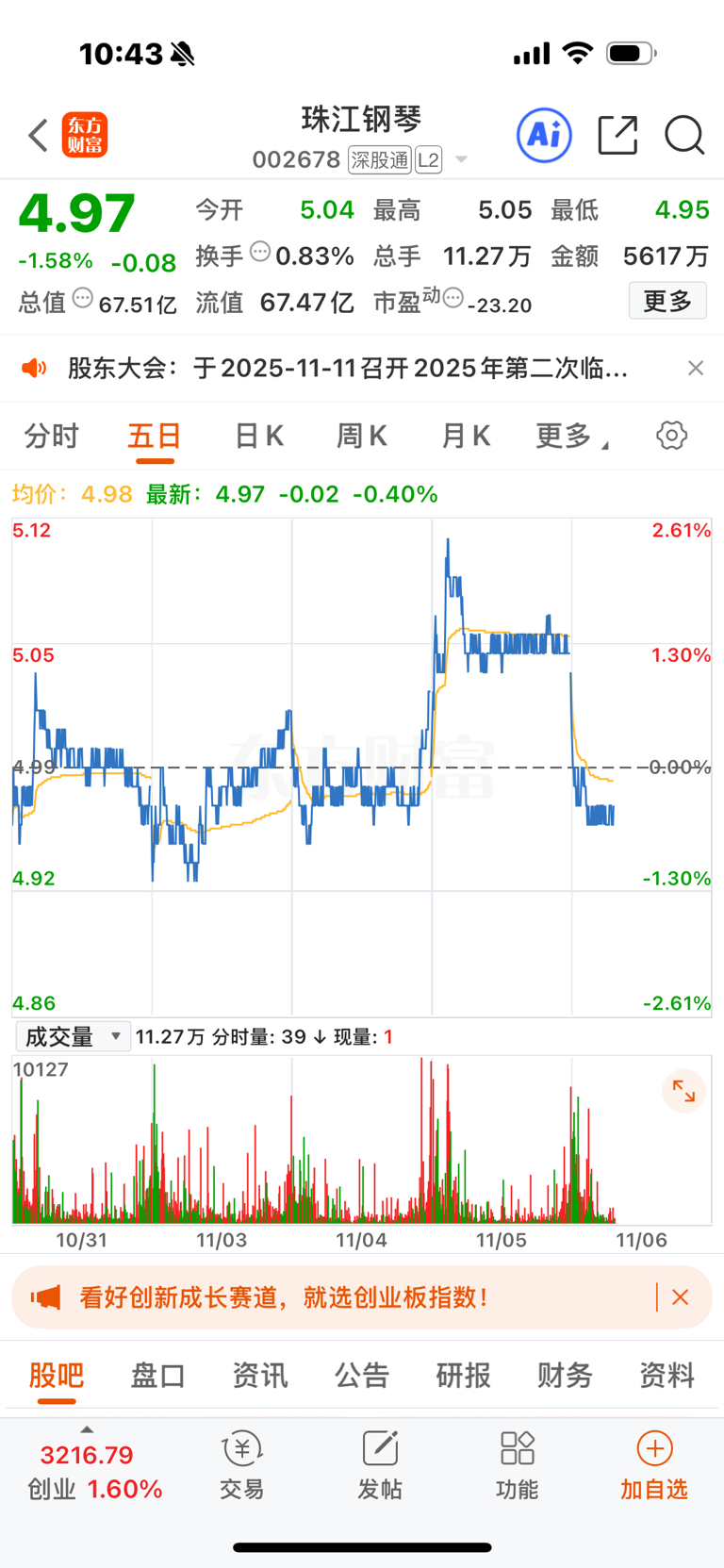 $珠江钢琴(SZ002678)$ 分时真漂亮