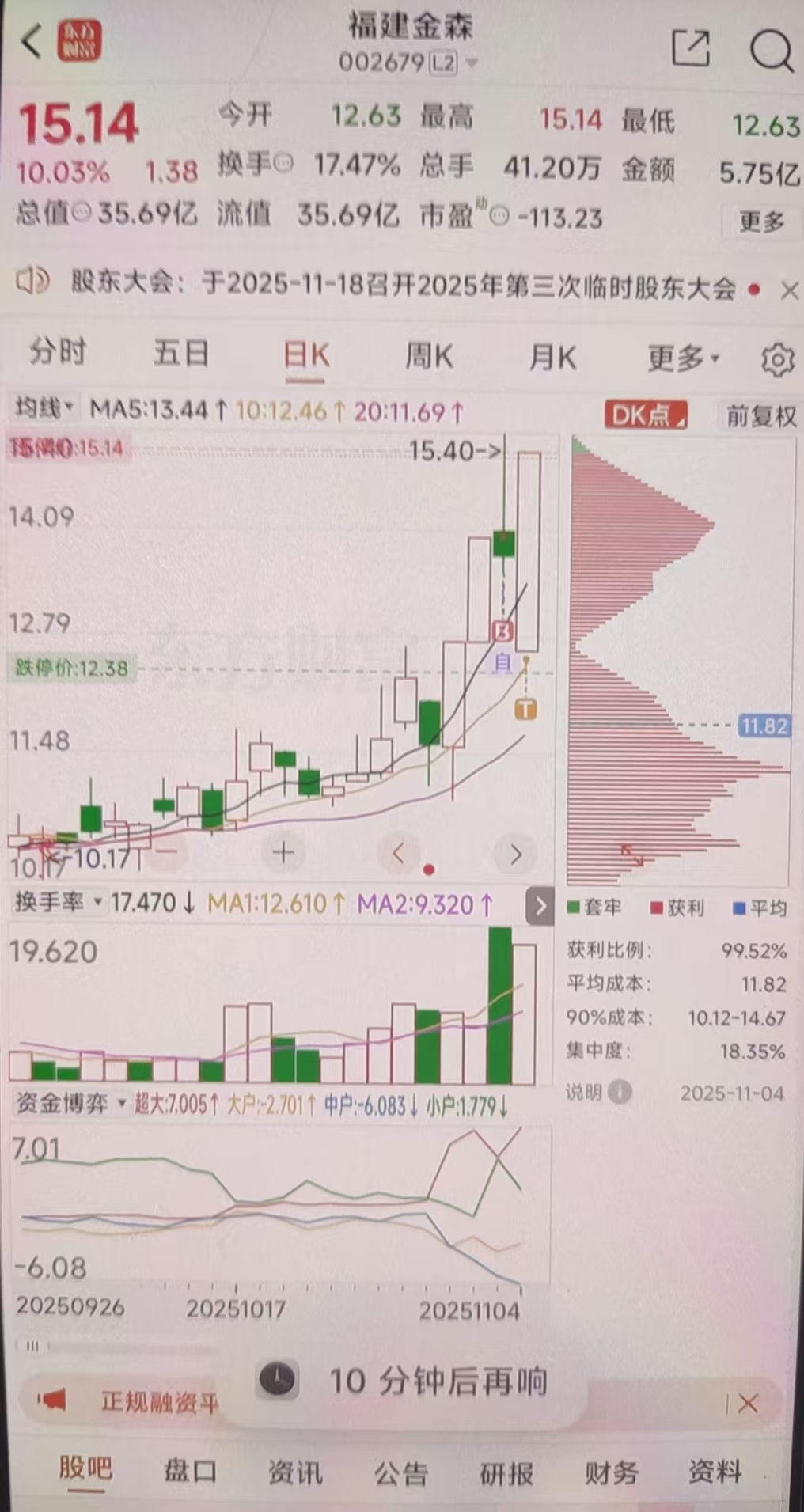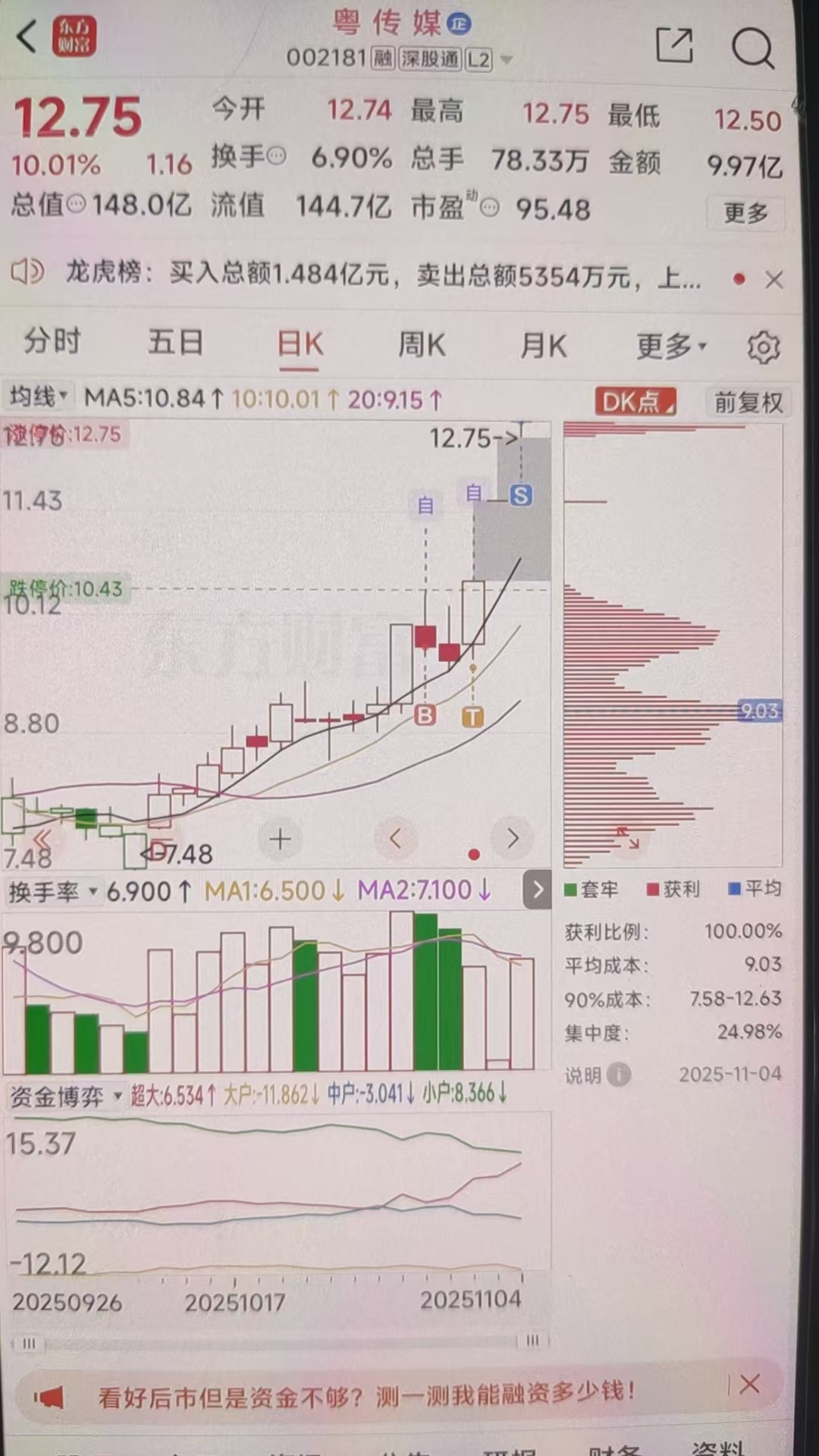 $福建金森(SZ002679)$ 粤传媒今天涨停卖了一半,做了五天,重仓吃了三个涨停。周一买的华东数控涨停板走了。周一买的福建金森继续看好,深水买入涨停t了底仓。总共吃了三个涨停分仓五个涨停利润。晚上继续复盘抓涨停,加油。