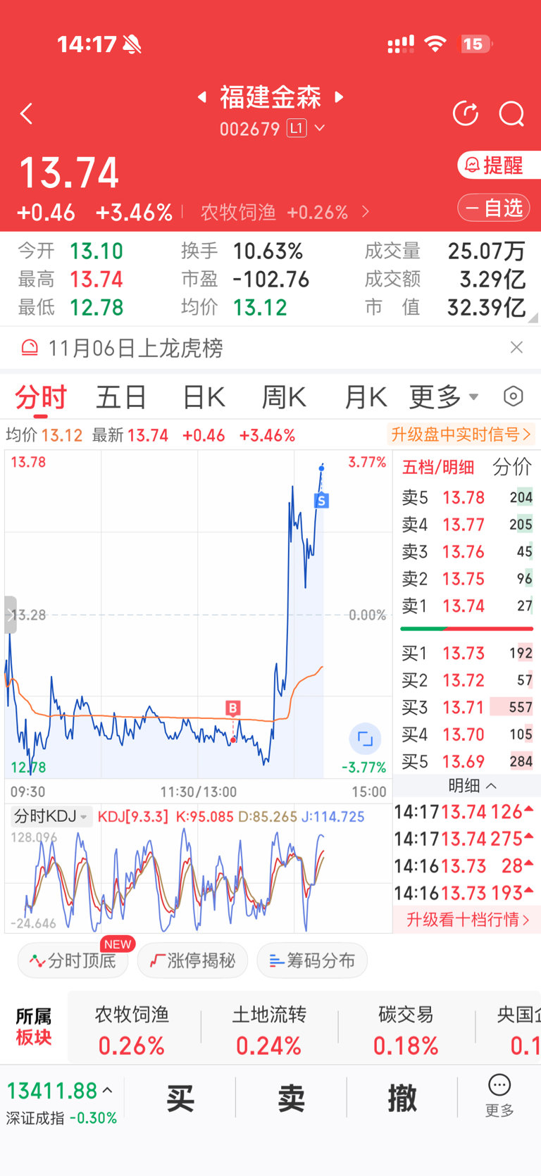 $福建金森(SZ002679)$ 不贪,今天T成功了,15.5进来,现在成本13.4