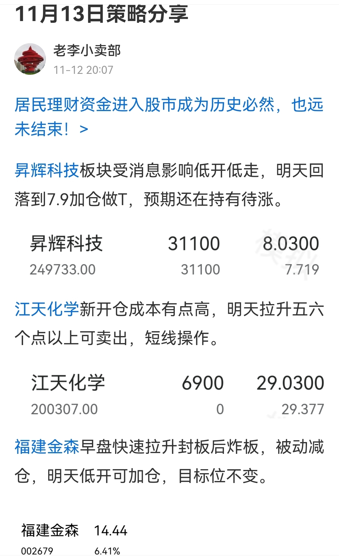 $福建金森(SZ002679)$ 早盘快速上板没封住被动先减,目标位不变详见13日策略分享
