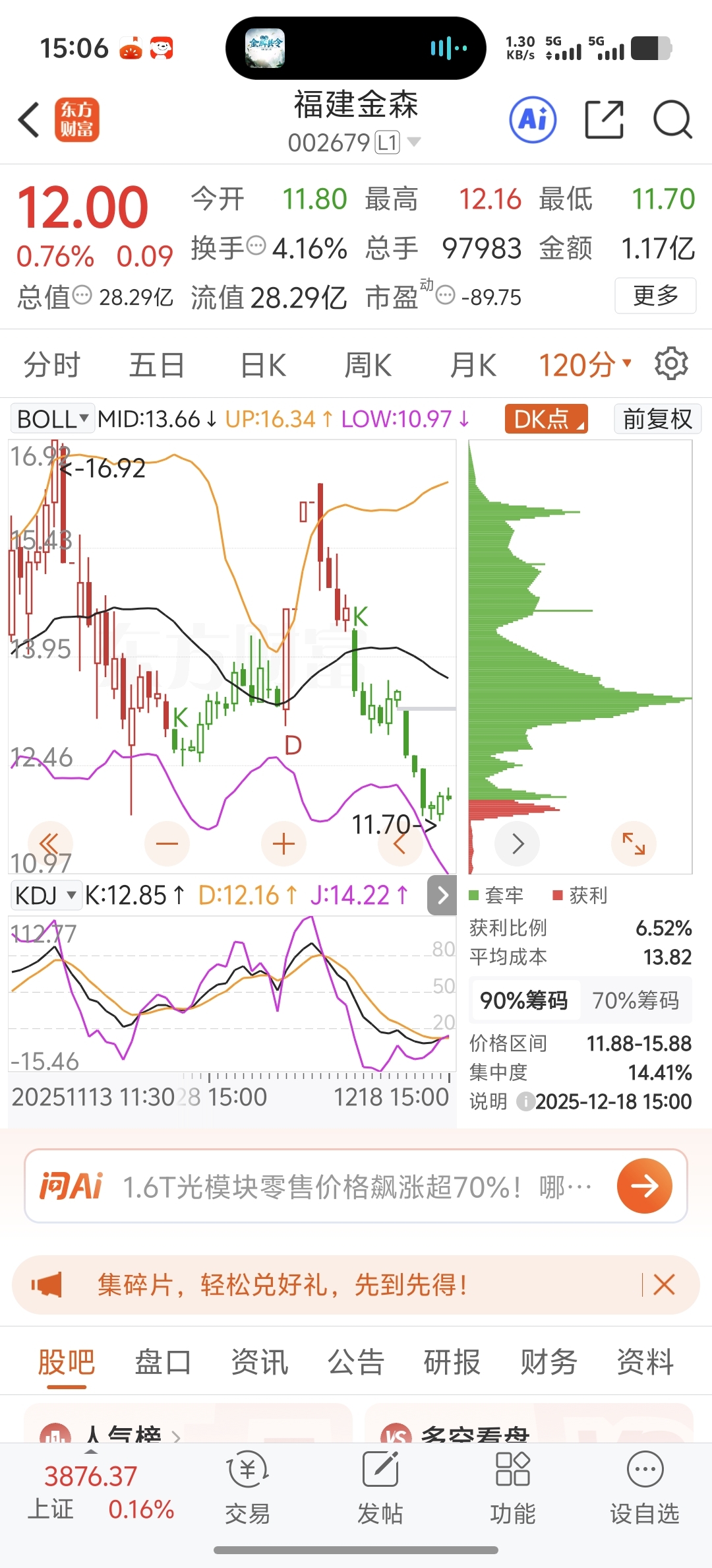 随便分析一下,本人也是前两天博反弹被发套,日线不是很清楚 120分线可以很清楚看到这个小十字星 浅看此星为下跌中继 信号本质是下跌趋势中缩量弱反弹后的整理,后续股价大概率在短暂横盘后,向布林带下轨10.97元甚至更低位置试探 若下周连续3天站上12甚至上攻12.5压力位则此信号失效,明天敬请期待