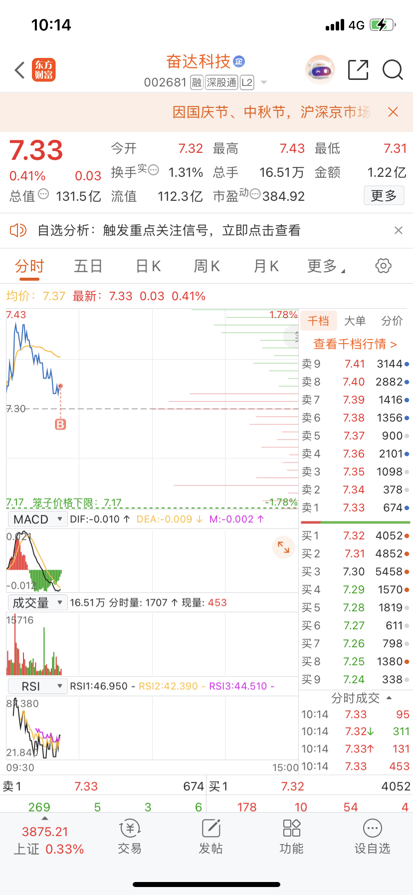 $奋达科技(SZ002681)$ 加一点,分时走的不错