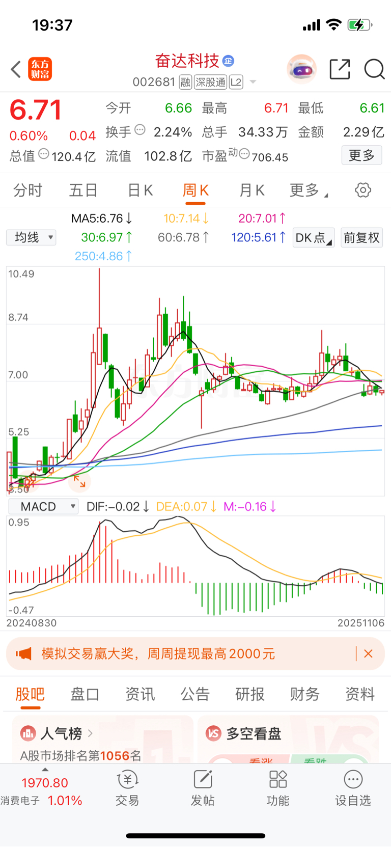 $奋达科技(SZ002681)$ 看看这四周...哎...明天周五又结束一周..下周定方向吗