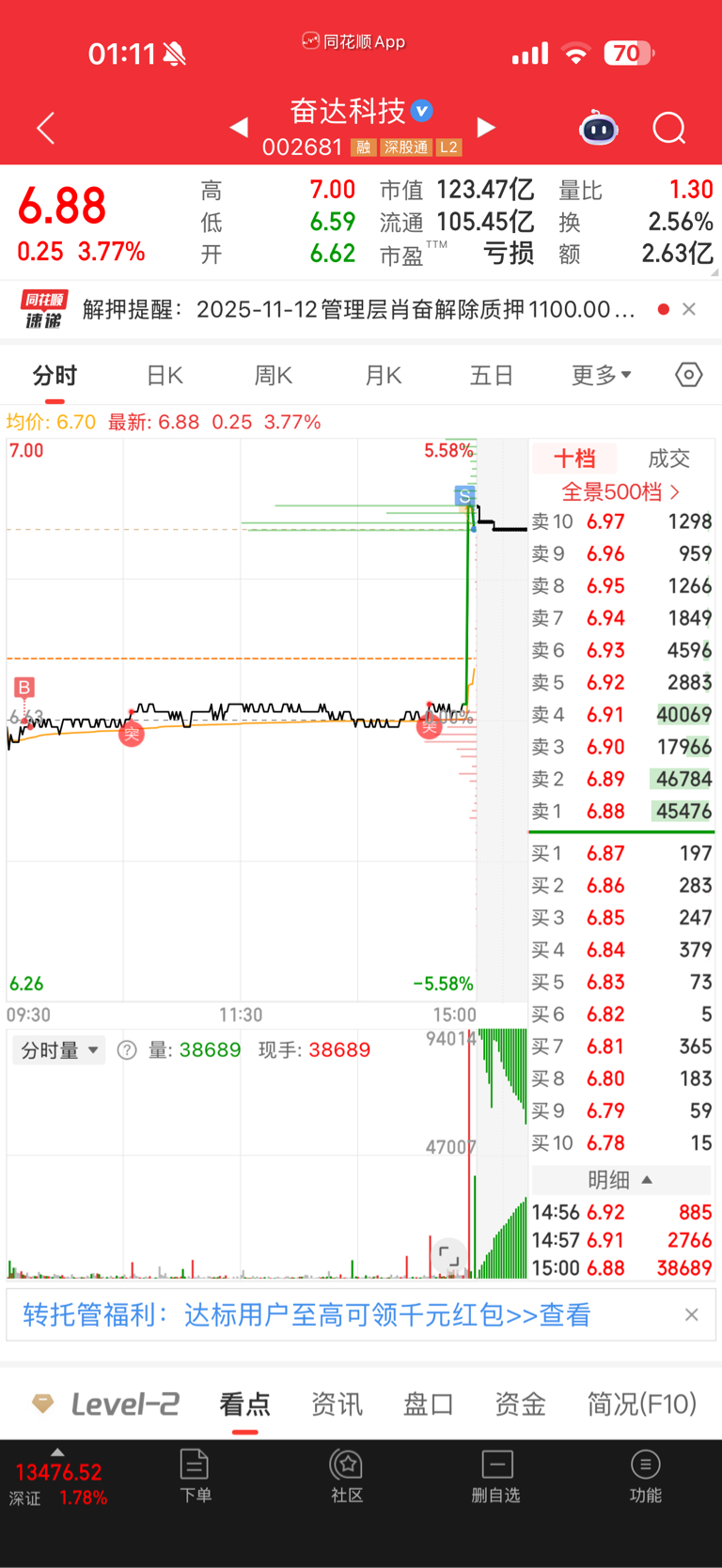 $奋达科技(SZ002681)$ 我突然觉得我强的可怕