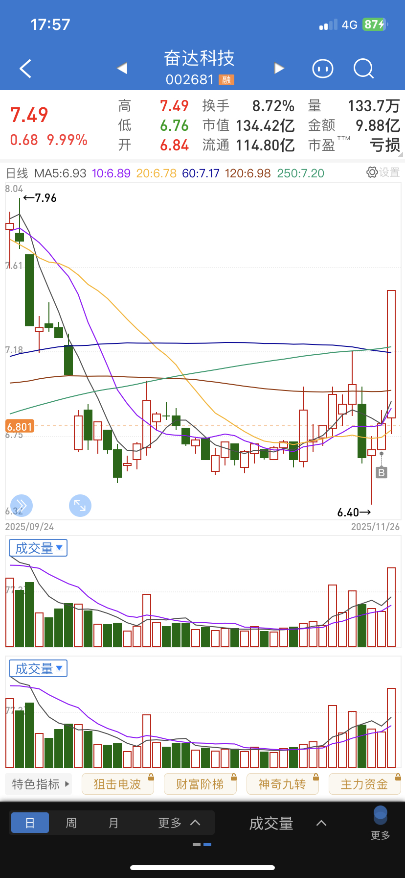 $奋达科技(SZ002681)$ 打了个底仓就33手,居然就涨停了,意外,可惜,小散难啊