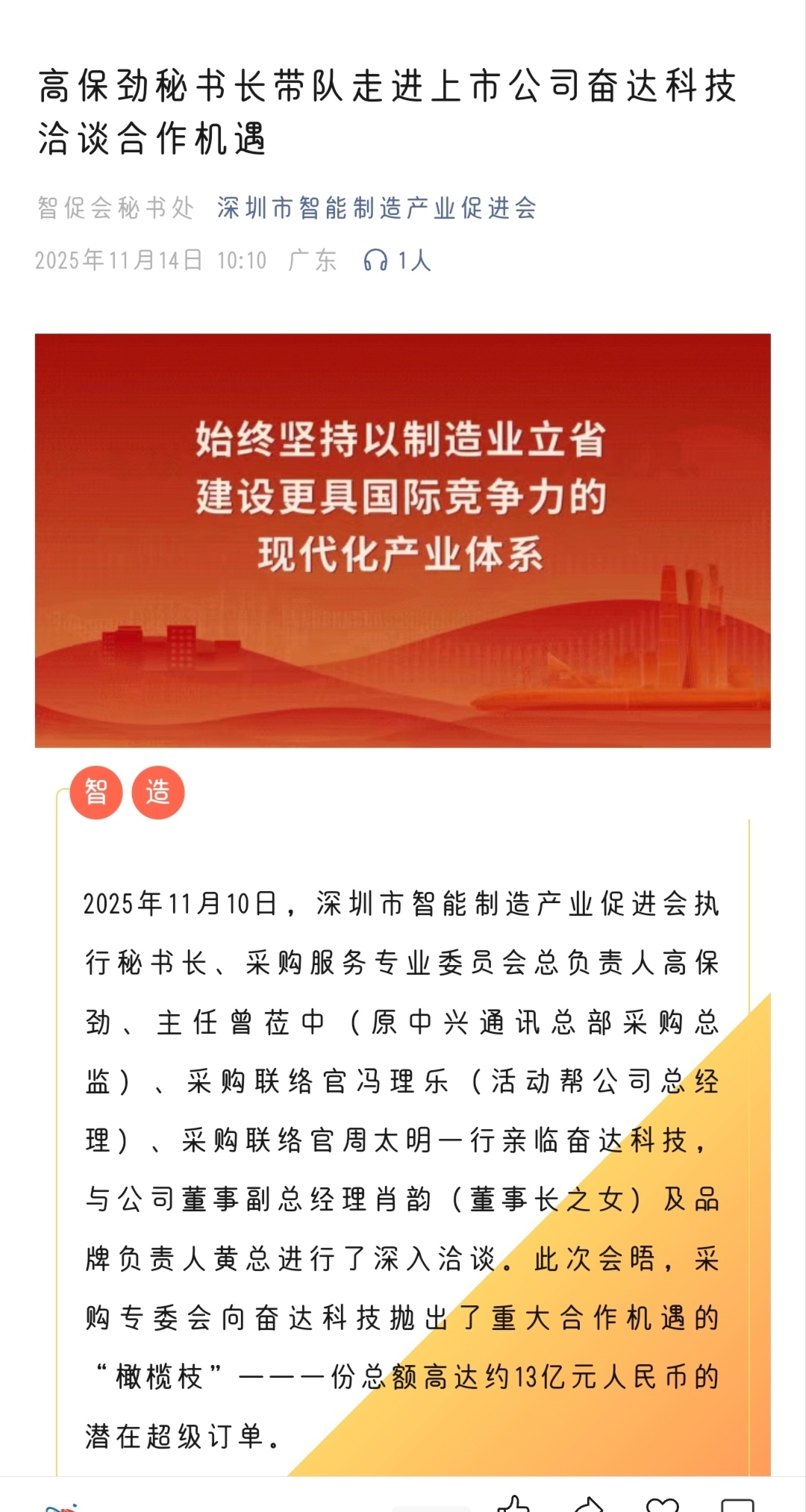 弱弱的问一下,深圳智能制造产业协会说要给奋达科技13亿订单,现在还有下文吗?