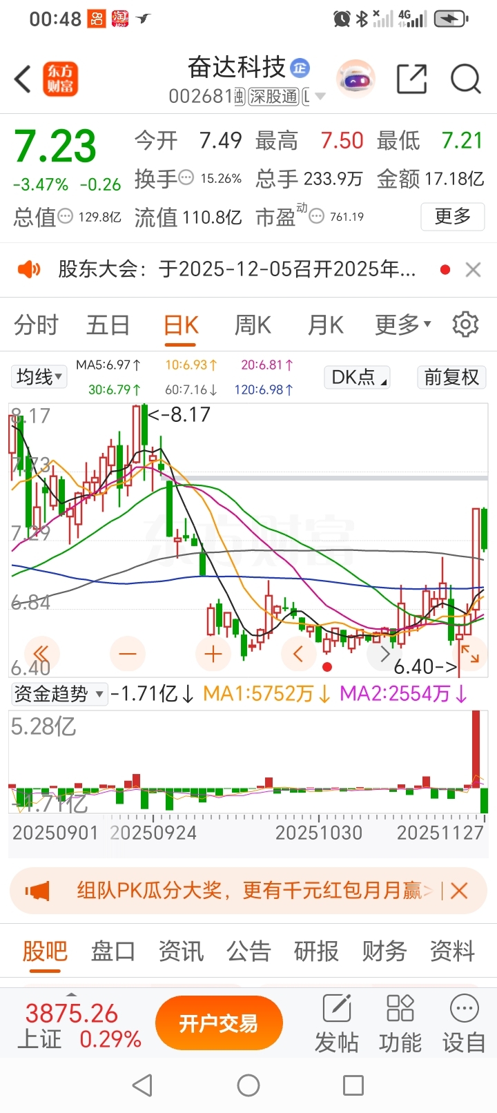 $奋达科技(SZ002681)$ 低位放大量,回调不过5个点强调整,后市看好。