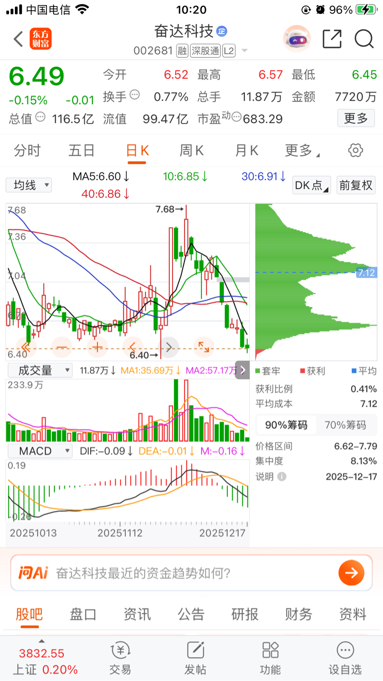 $奋达科技(SZ002681)$ 最坏结果是6.40元,大家不必恐慌,主力同样也被套,坚守阵地!