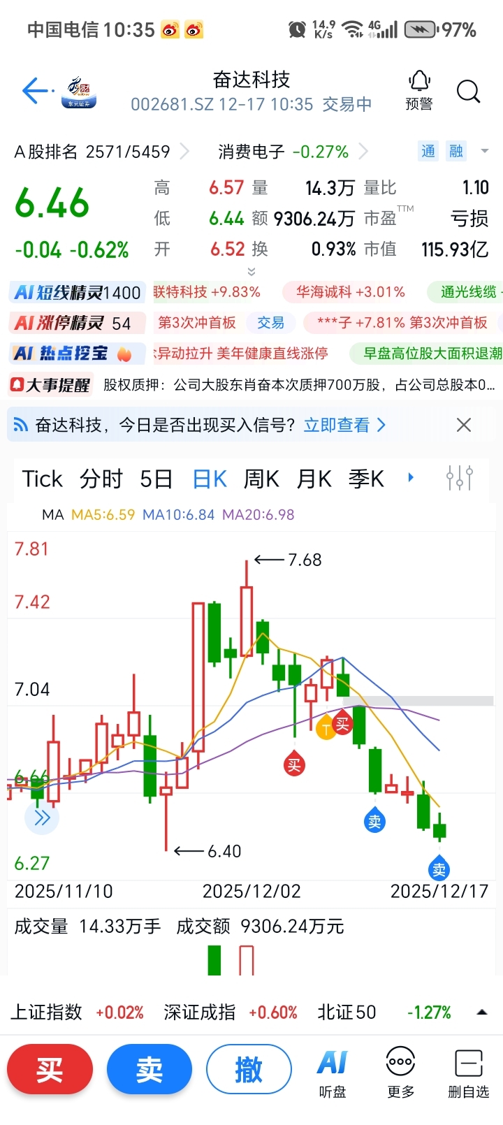 $奋达科技(SZ002681)$ 7.4的本,今天早上6.46清仓了。。。。实在受不了。。。