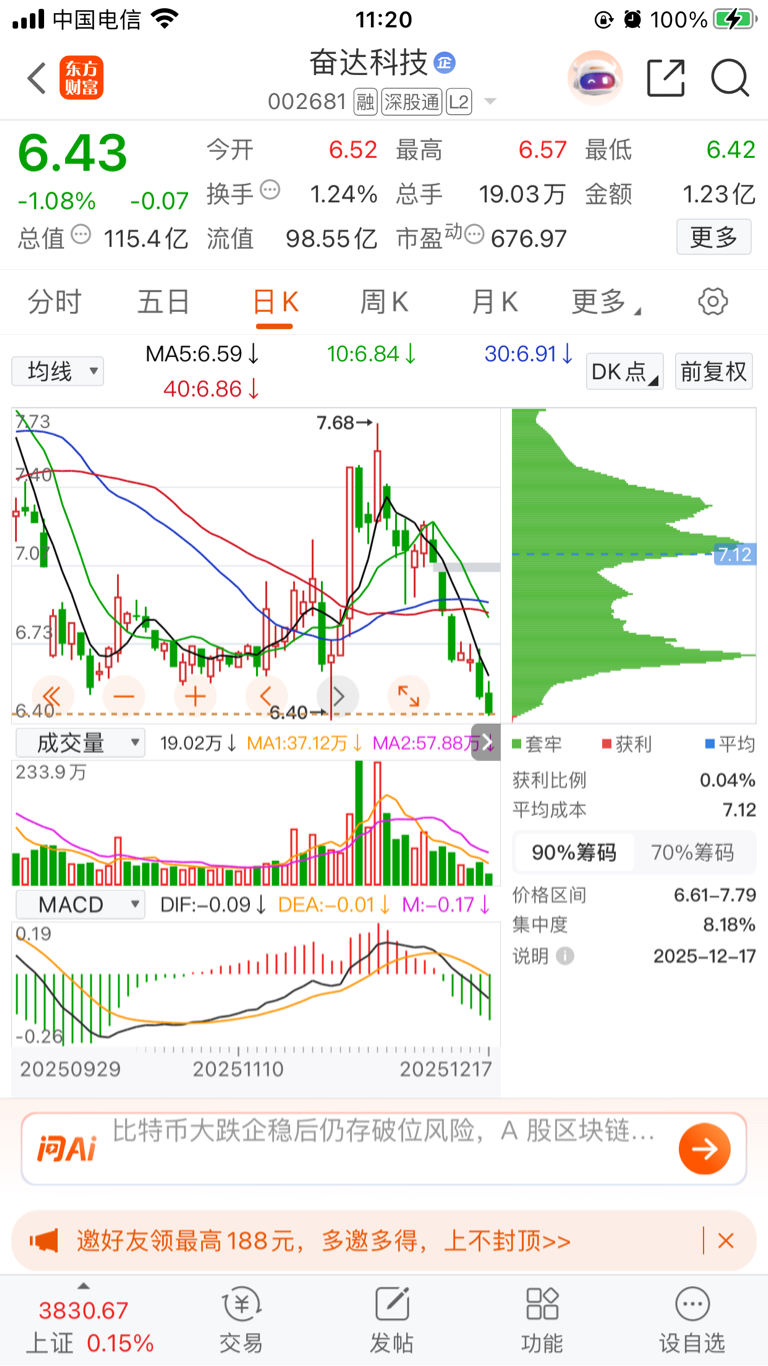 $奋达科技(SZ002681)$ 飞流直下三千尺,疑是银河落九天,就看6.40会不会跌破。#炒股日记#
