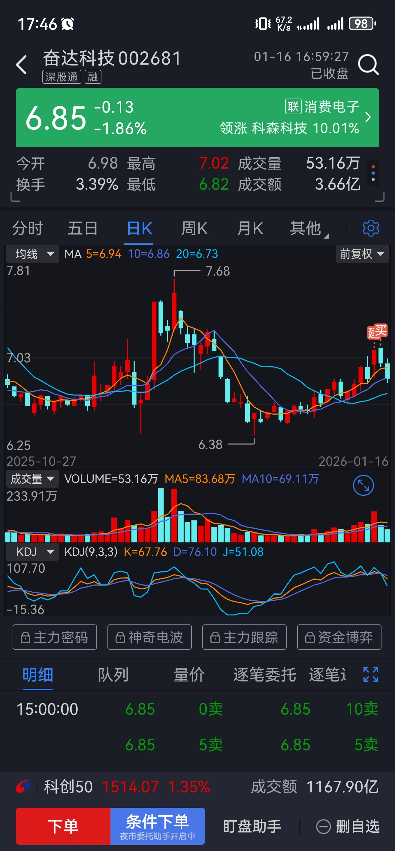 $奋达科技(SZ002681)$ 真不友好,刚来就挂山顶。