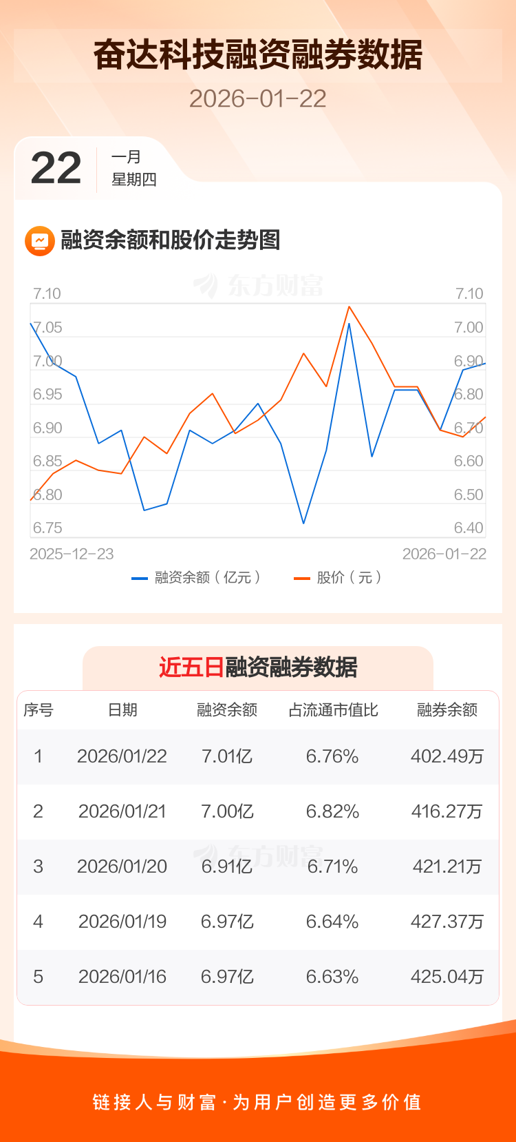 交易所最新数据显示,奋达科技于2026年1月22日获融资买入2434.62万元,融资偿还2351.10万元,当日融资净买入83.51万元。目前,该股融资余额7.01亿,占流通市值比例为6.76%。