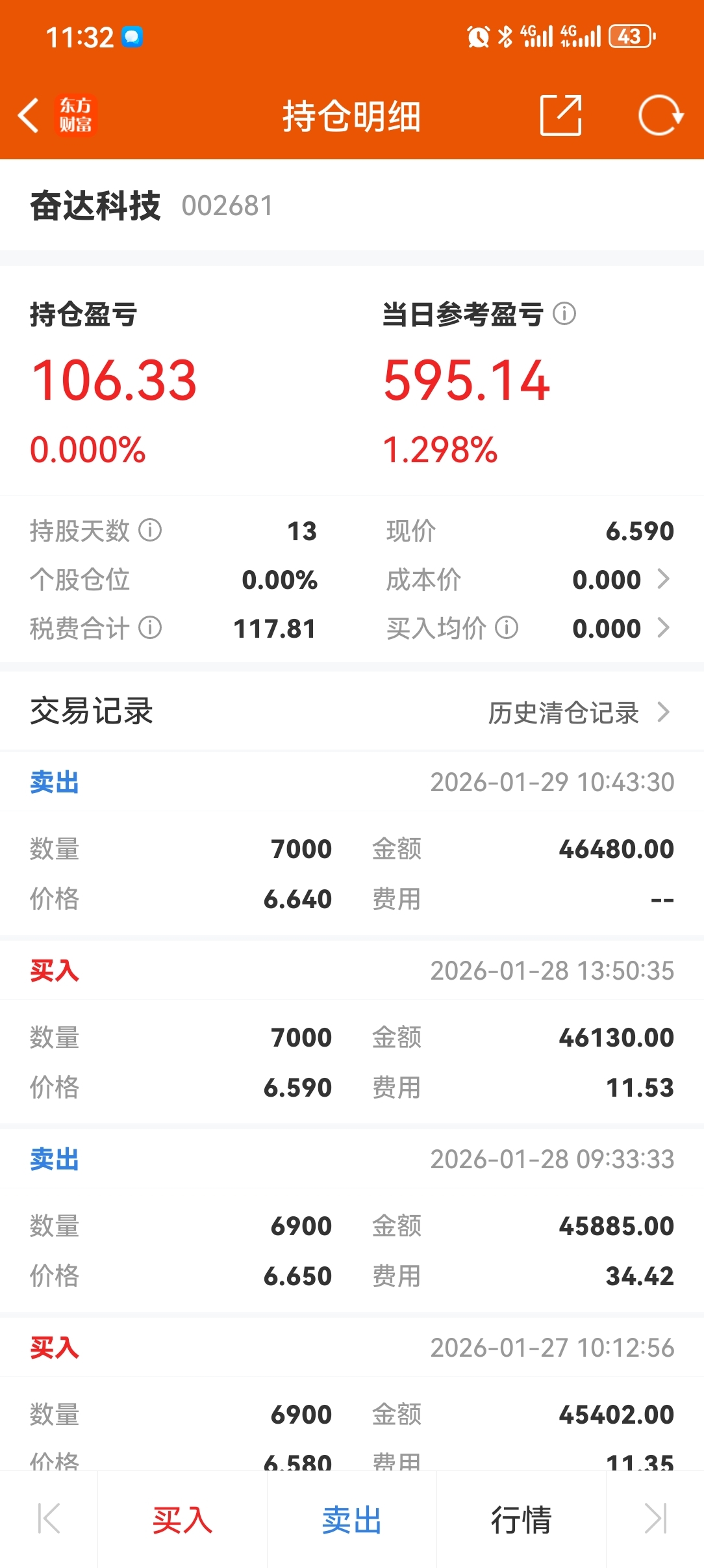 $奋达科技(SZ002681)$ 6.88进的,今天解套,清仓走人,下跌趋势,幸好这段时间进了化工,这个月还是盈利10个点