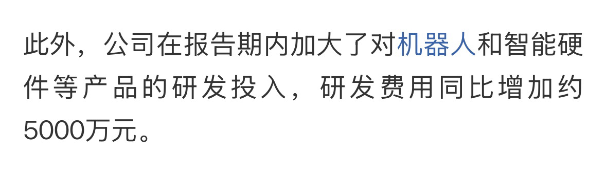 $奋达科技(SZ002681)$ 提前告诉你知道达公司进军机器人亏6000-8000万,研发机器人增加5000万是亏损利好还是亏损利好让你们自己判断哈!