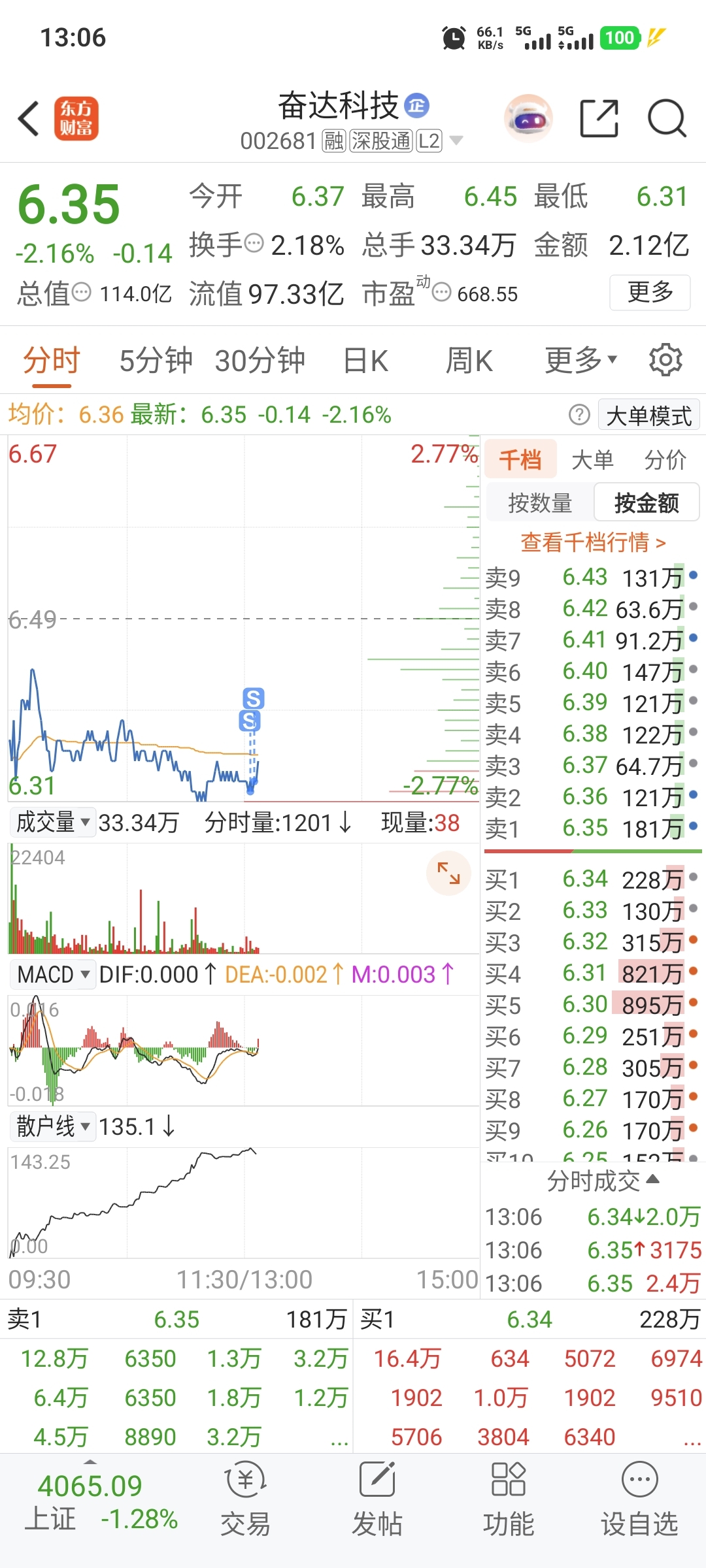 $奋达科技(SZ002681)$ 一万多股走了,拿了半年,你可以涨了