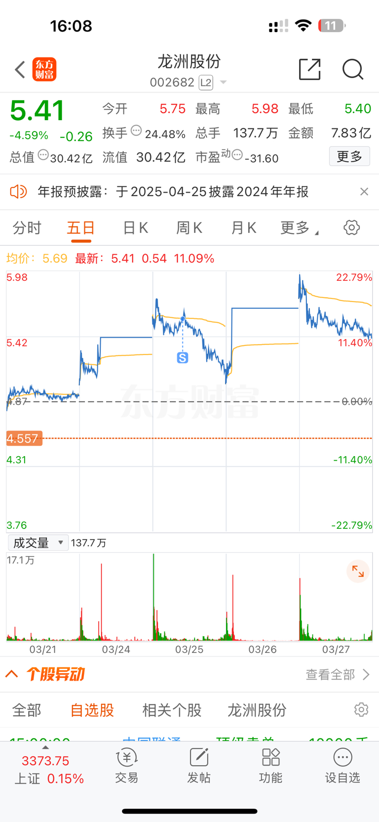 $龙洲股份(SZ002682)$ 服了今天挂5.99卖单没打到我真服了你 今天还不能二板定龙头 主力在玩什么啊 给大家伙整迷糊了你到底是要涨还是要跌啊 明天肯定不会涨停了 只会低开低走震荡 要回5元下方了 结束了 不动了 我跟主力一样成本线我不怕