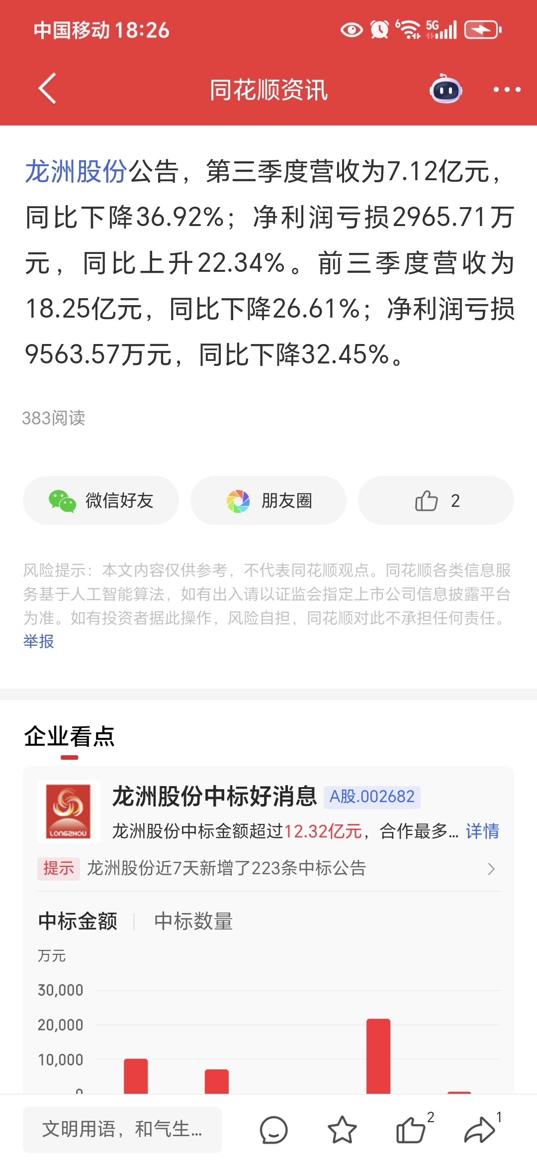 $龙洲股份(SZ002682)$ 中标12.3亿相比亏损3000万可以忽略把