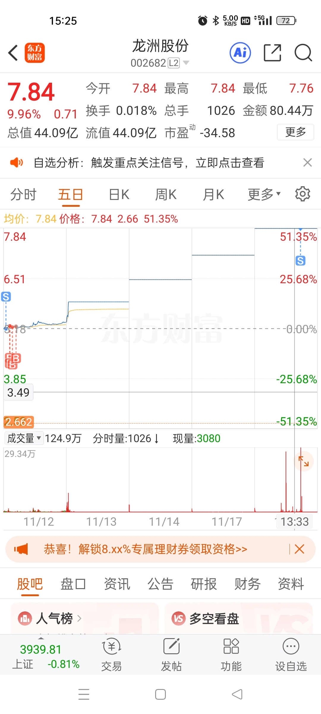 第一次吃这么饱的,涨停前一天本来三层仓位的,一个下杀骗我卖出,越想越不对劲红一个点追回来,直接梭哈满仓干进去了。今天成交量有点大先出来一半仓位还有一半在里面慢慢玩随它折腾半仓成本2.66。